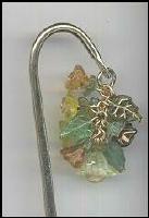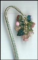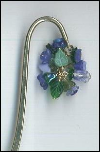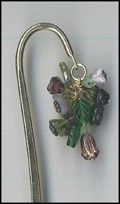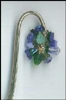 Shepherd’s Hook bookmark in purples and lavenders. New Czech and vintage glass flowers and leaves form the 1 ½” by 7/8” cluster. Gold plated bookmark is 4 ¾” long. |