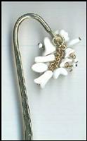 Shepherd's Hook bookmark in brass ox finish. The flowers are all vintage German white glass, with cute dangling centers. The flower cluster measures 2" long by 7/8" across. Bookmark is 6" long. |