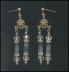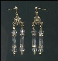 Gold Ox plated pierced earrings with vintage crystals. Vintage Swarovski Crystal rounds flank crystal cylinder shaped beads with Czech rhinestone rondelles for a little extra sparkle. Gold ox stampings. Earrings measure 2” by 1/2”. |