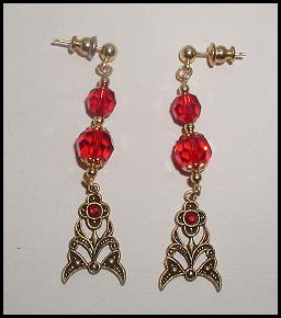 Brass Ox pierced earrings. Vintage Light Siam Swarovski crystals hang from brass ox settings with a Siam rhinestone. Earrings measure 2” by ½”. |