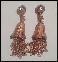 Copper clip earrings with all vintage components. Aurora borealis glass, copper plated chain and bell. 2 inches long. |