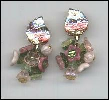 Gold plated clip earrings. Vintage foiled glass leaves in pale yellow with a rose stripe sit above a cluster of vintage and new Czech glass flowers. Earrings measure 1 5/8”. |