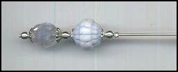 Three inch long silver plated hat pin with vintage beads. The top bead is a vintage German blue Givre crystal, 8mm. The bottom bead is a vintage glass bead with indented lines going both directions; it has light blue accents in the indented lines. Silver plated beadcaps and spacer beads. |