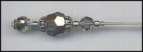 Three inch long silver plated hat pin with vintage crystals. The top bead is a Swarovski highly faceted Medium II crystal. Vintage Swarovski Starlight AB crystals, 12 & 6mm are the middle and bottom beads. Silver plated bead caps & spacer beads. |
