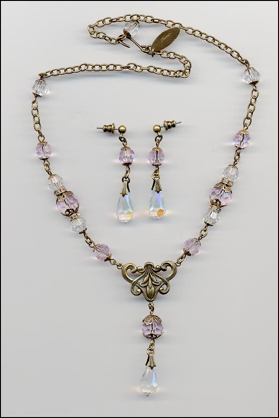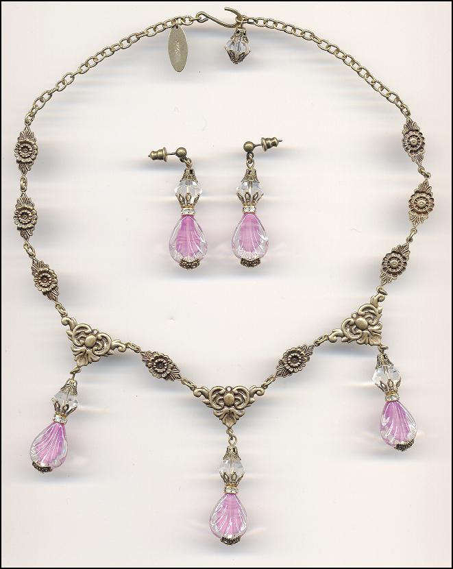 Necklace and earring set with new Czech lampworked glass drops. Drops are Deco style and are clear glass with pink inclusions. Drops are linked with Crystal bicones. Brass ox bead caps, chain, and findings complete the necklace. Necklace adjusts from 15 to 17” long; matching earrings are 1 ¾” long by ½” across. Pierced posts can be changed to wires, lever backs, or clips at no charge. |