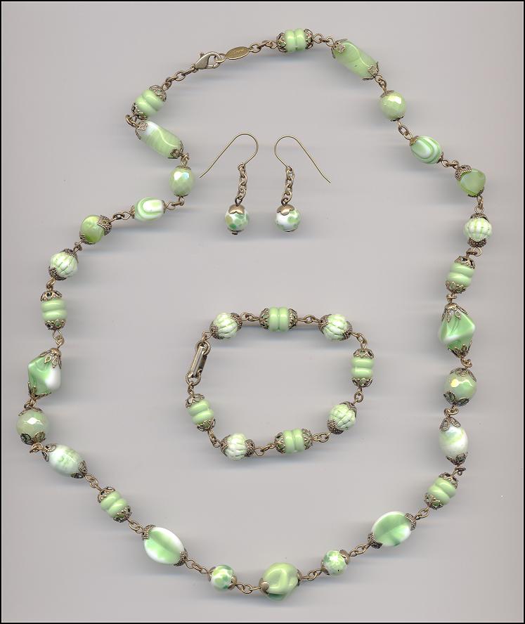 Necklace, bracelet, and earring set of vintage glass beads in shades of green and white. Nice combination of Czech, German, Japanese beads in a pleasing variety of shapes. Necklace is long, measuring 26” long (I would be happy to shorten on request). Brass ox plated bead caps and findings. Bracelet measures 7 ½” long and 3/8” across, with a fold over clasp. French wire earrings are 1” long and 3/8” across (I can change them to pierced posts or clips on request). A great set! |