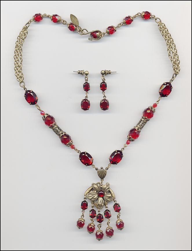 Necklace with vintage deep Ruby colored glass beads and stones. Brass ox pronged settings, bead caps, chain. The center of the necklace has a brass ox flower set with a small vintage stone with more stones. Beads are vintage Czech firepolished ruby colored glass. Necklace adjusts from 16 ½” to 18” long; I can lengthen or shorten it on request. Matching earrings are pierced posts measuring 1 3/8” by 3/8” across (I can change them to clips or French wires). |